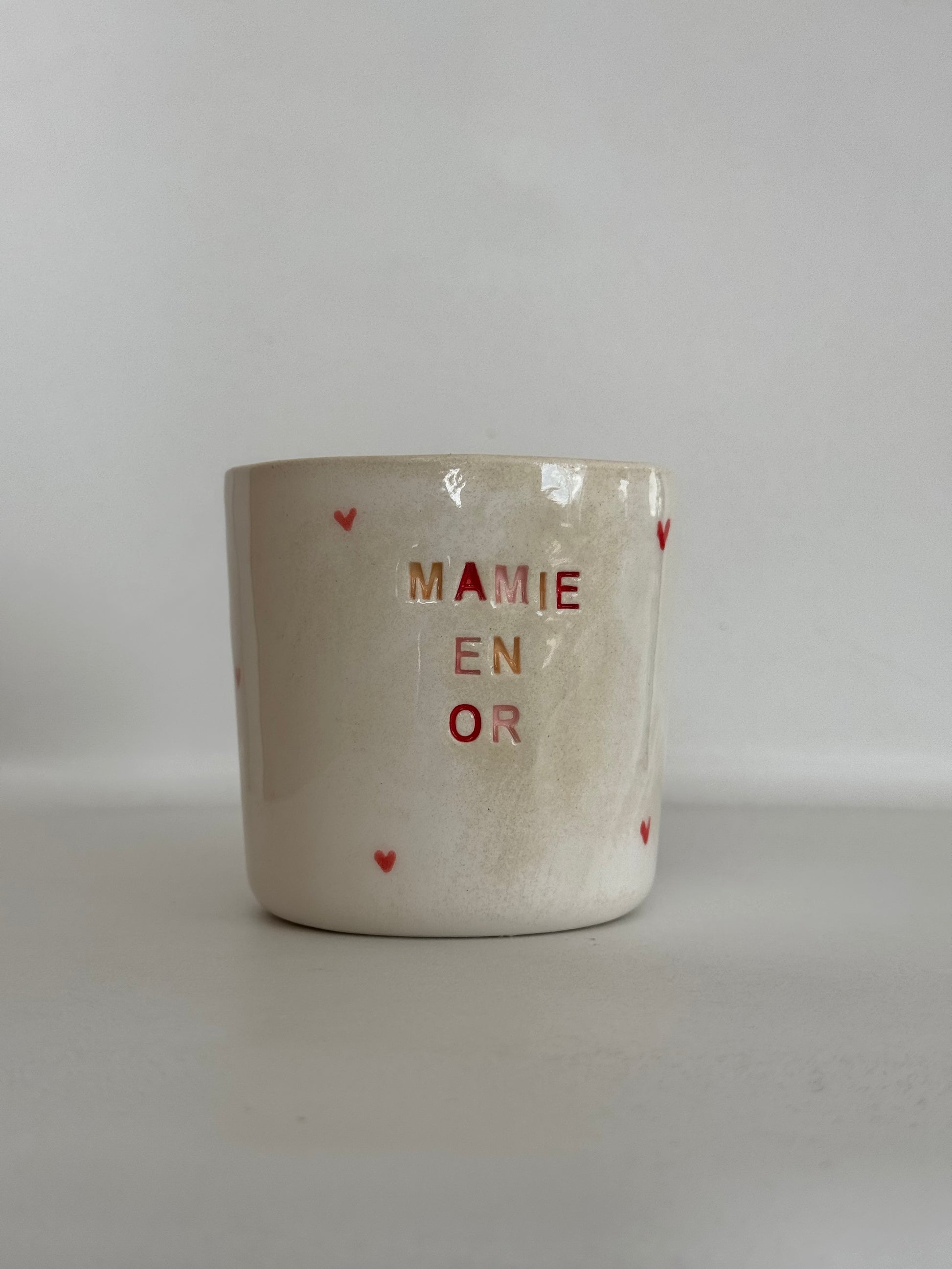 Ce mug "Mamie en Or" arbore une inscription délicate et lumineuse, réalisée à la main. Chaque pièce est unique, comme la mamie à qui elle est destinée.